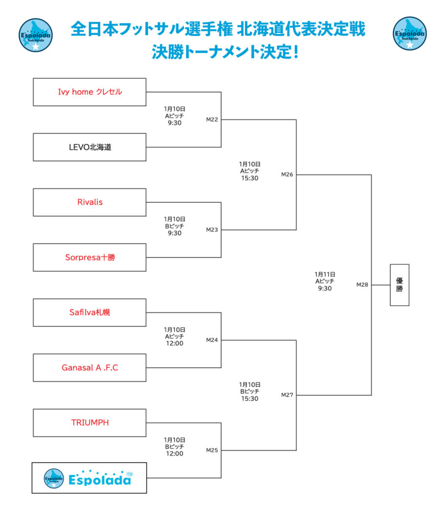 エスポラーダ北海道の初戦は、1月10日(土)12:00キックオフで対戦は「TRIUMPH」さんです。 本戦出場をかけた戦いとなります。熱い応援をよろしくお願いいたします!